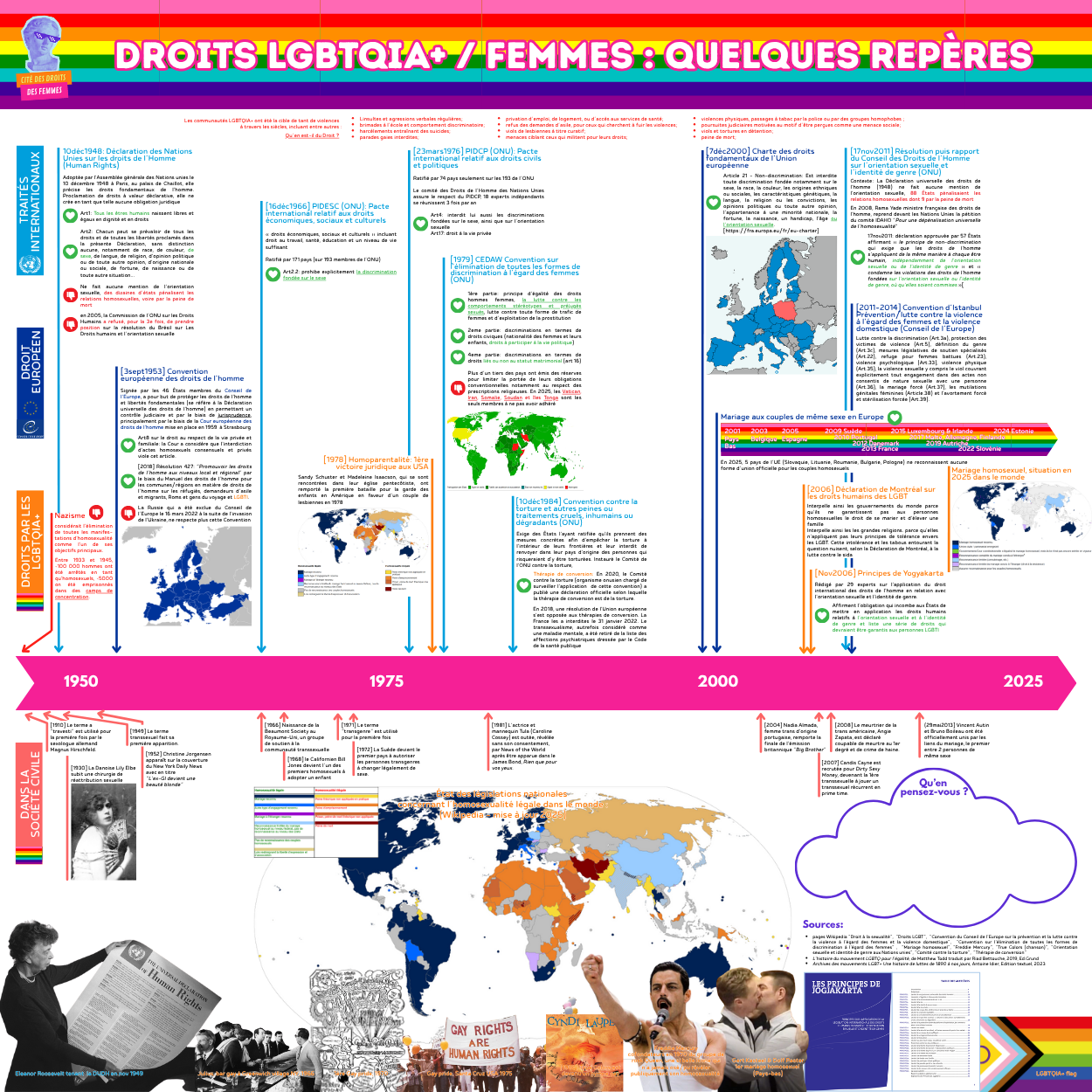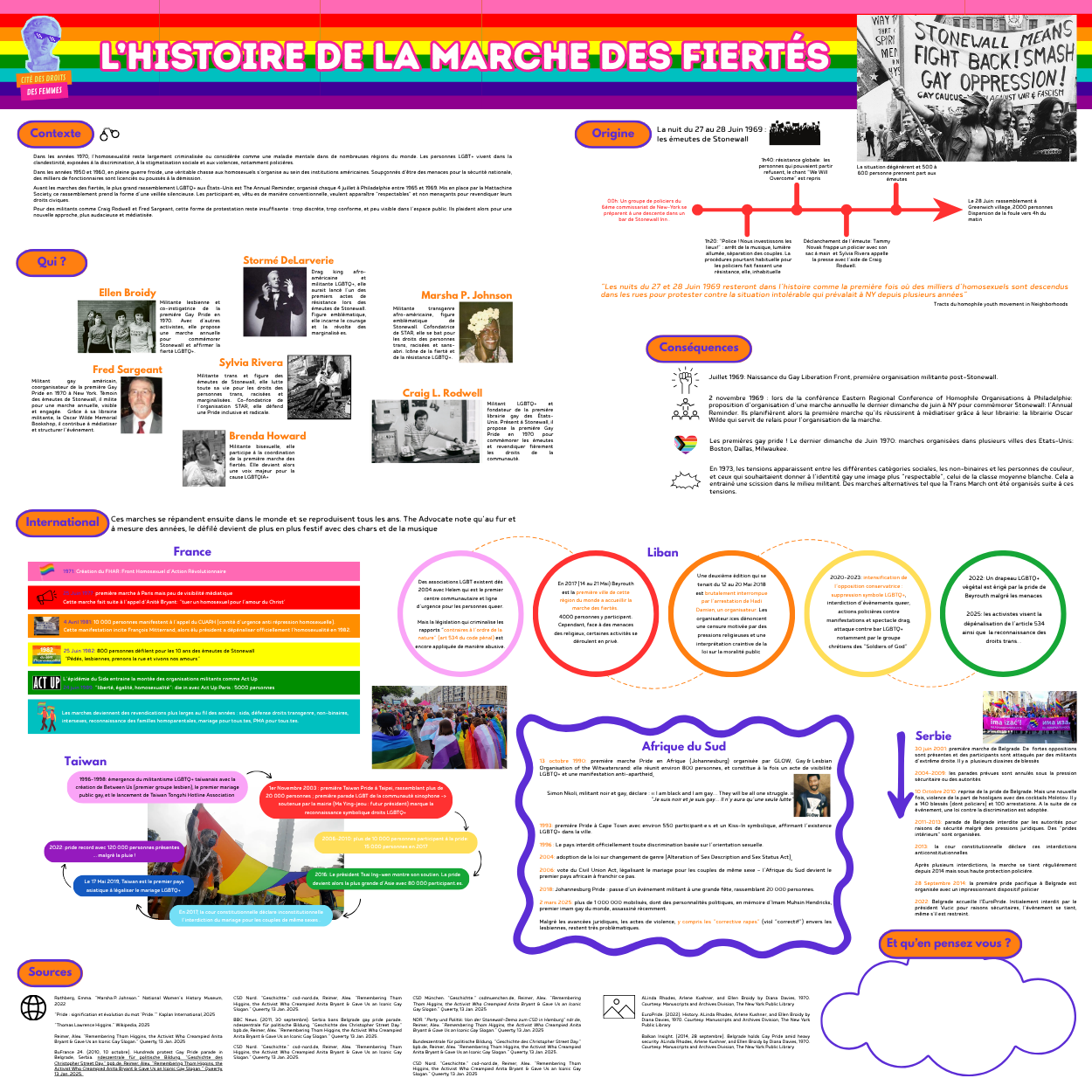 Et pour finir, nous remercions notre super stagiaire Margot Maillet-Reveillon qui a produit 2 des 3 beaux grands posters de 2m sur 2m décorant/informant l’extérieur de notre char de parade: le 1er sur l’histoire de la marche des fiertés, le 2e sur les évolutions et régressions de l’égalité de genre par région dans le monde, et un 3e que nous avons conçu sur l’histoire des droits LGBTQIA+