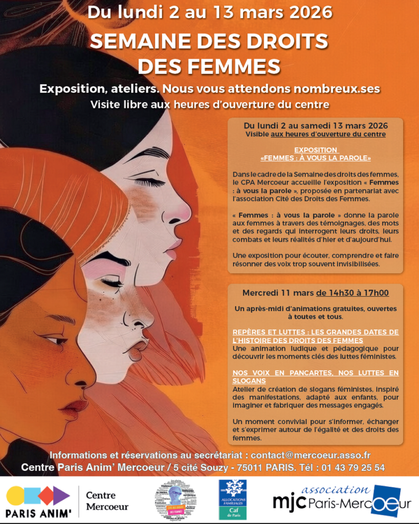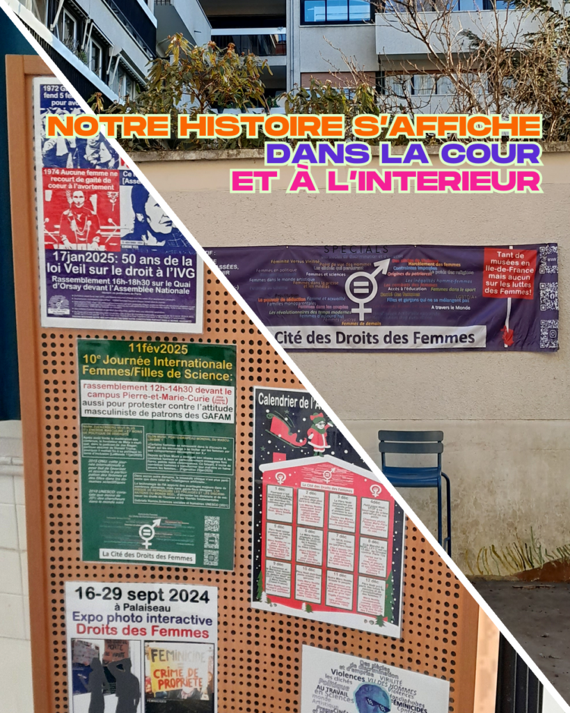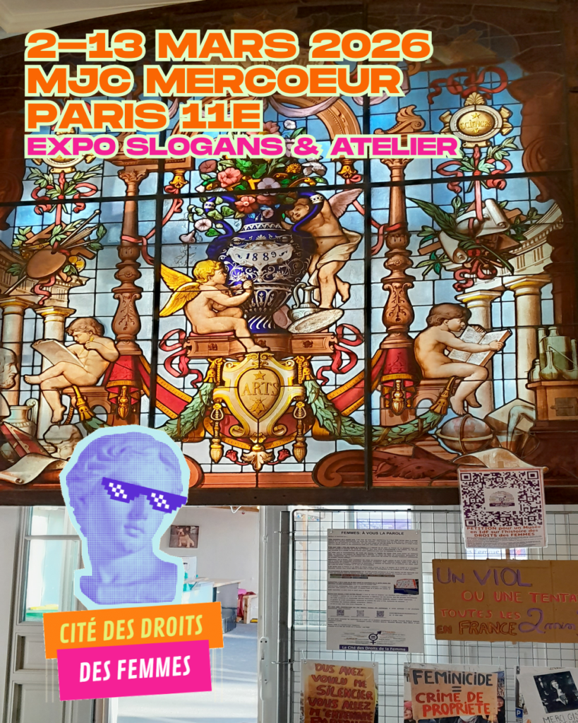 Le 2 mars dernier, nous avons installé notre exposition photo interactive portant sur les slogans du cortège parisien du 8 mars 2023 sur les 3 étages de la MJC Mercoeur à Paris 11e ; et aussi des éléments de l’histoire de notre association.