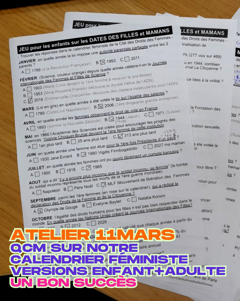 Le mercredi 11 mars, nous avons organisé un atelier pour dessiner des pancartes, et aussi un jeu avec un questionnaire (version enfant et version adulte) portant sur des dates/femmes illustres à retrouver dans notre calendrier féministe 2026 qui était affiché au milieu de notre expo.