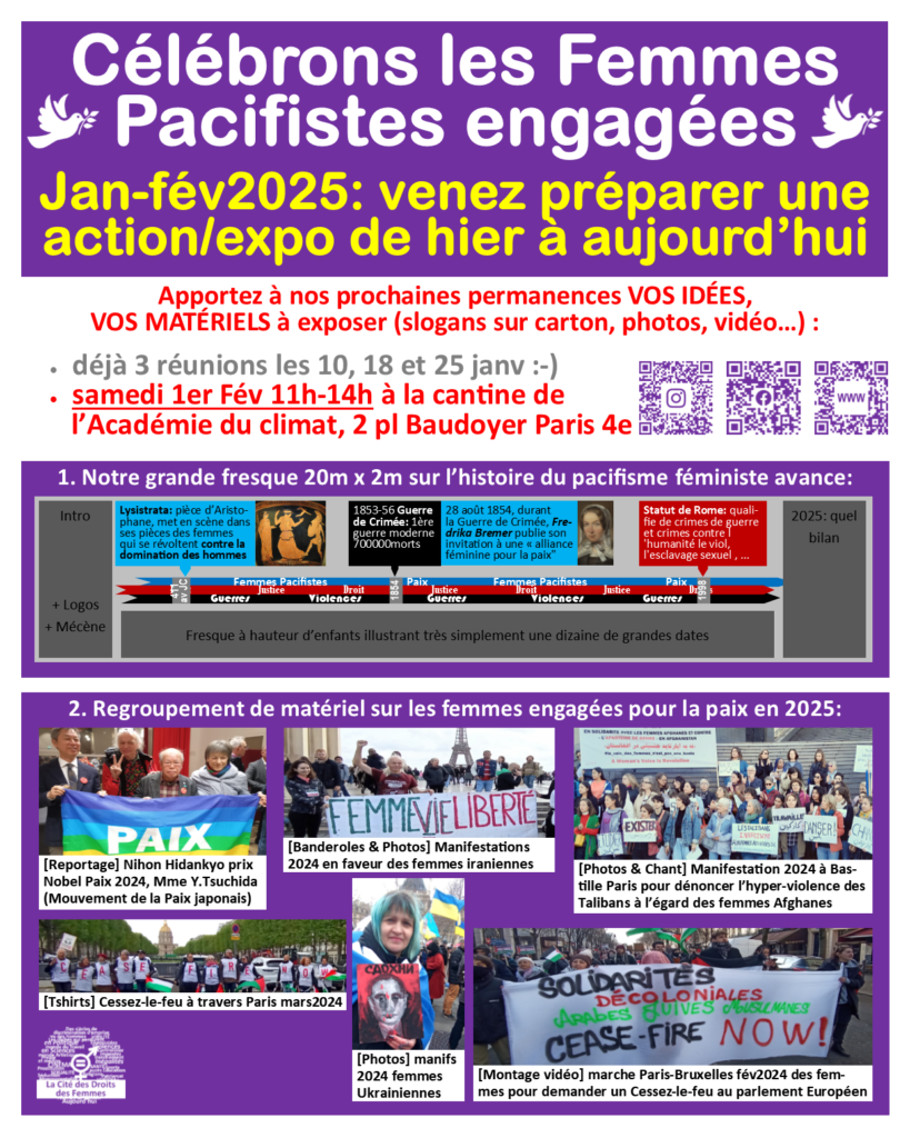 Plus d’infos sur https://citedesdroitsdesfemmes.fr/2024/12/08/10dec2024-mars2025-femmes-actrices-de-la-paix/
