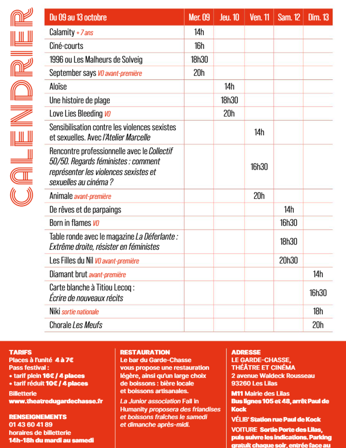 La Ville des Lilas organise la troisième édition de son festival du film féministe, du 9 au 13 octobre 2024. Ce festival met à l’honneur les réalisatrices et réalisateurs engagés sur les thèmes de l’égalité et des violences sexistes et sexuelles et œuvre pour une juste représentation des femmes dans le cinéma en programmant une majorité de films de réalisatrices.
